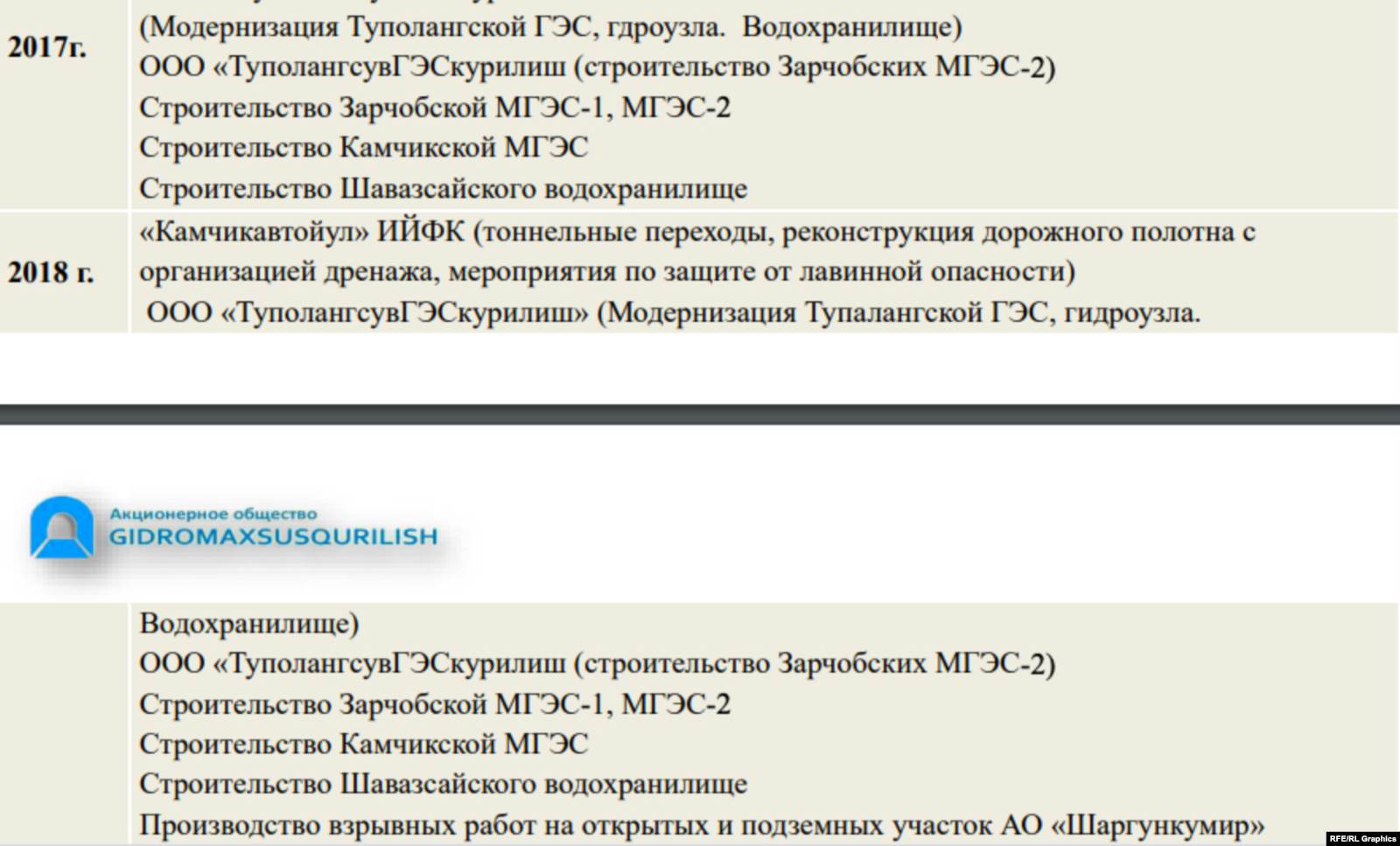 В своем бизнес-плане за 2019 год АО «Гидромахсускурилиш» – дочернее предприятие государственной компании «Узбекгидроэнерго» – привел список строительств, в которых участвовал с момента образования компании в 1961 году по 2019 год.