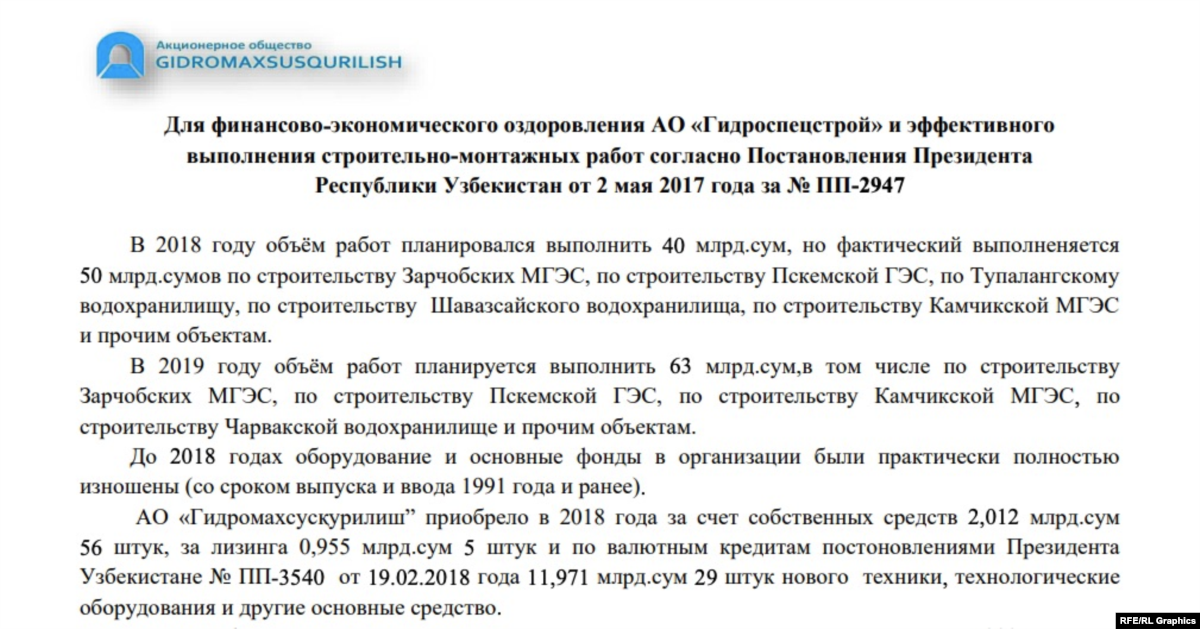 В бизнес-плане АО «Гидромахсускурилиш» указано, что в 2018 году компания приобрела техническое оборудование за счет кредита в размере 11.9 миллиарда узбекских сомов (1,1 миллиона долларов) на основании постановления Мирзиёева от февраля того же года. На основании этого постановления из государственного Фонда реконструкции и развития Акционерному коммерческому банку «Туронбанк» были выделены 60 миллионов долларов США для использования их в качестве кредита для предприятий в системе «Узбекгидроэнерго».