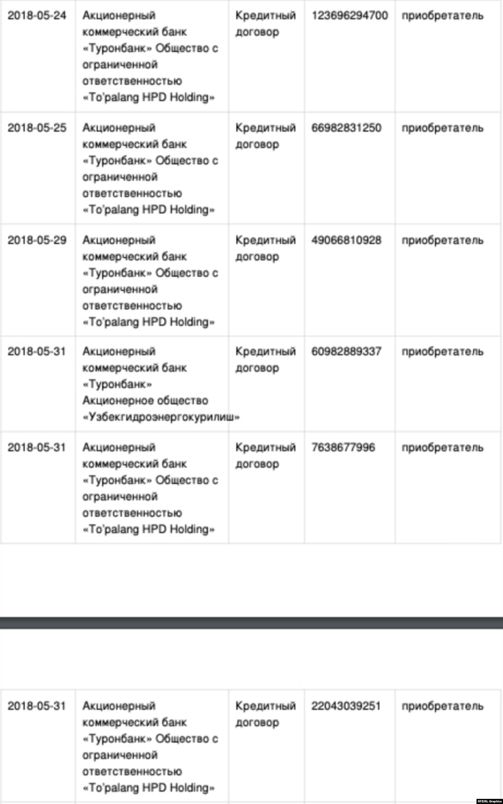 Этот договор подразумевал выделение «Туронбанком» кредита в размере 40 миллиарда сумов (5 миллионов долларов) для исполнения договора, подписанного между «Узбекгидроэнерго» и «Гидромахсускурилиш». Что именно было объектом договора между этими двумя компаниями, обе из которых находятся под контролем Сангинова, не разглашается.